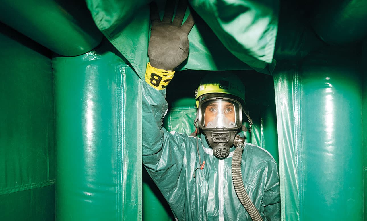 På en byggeplads i Brøndby Strand går en gruppe forskere rundt godt gemt i beskyttelsesdragter.