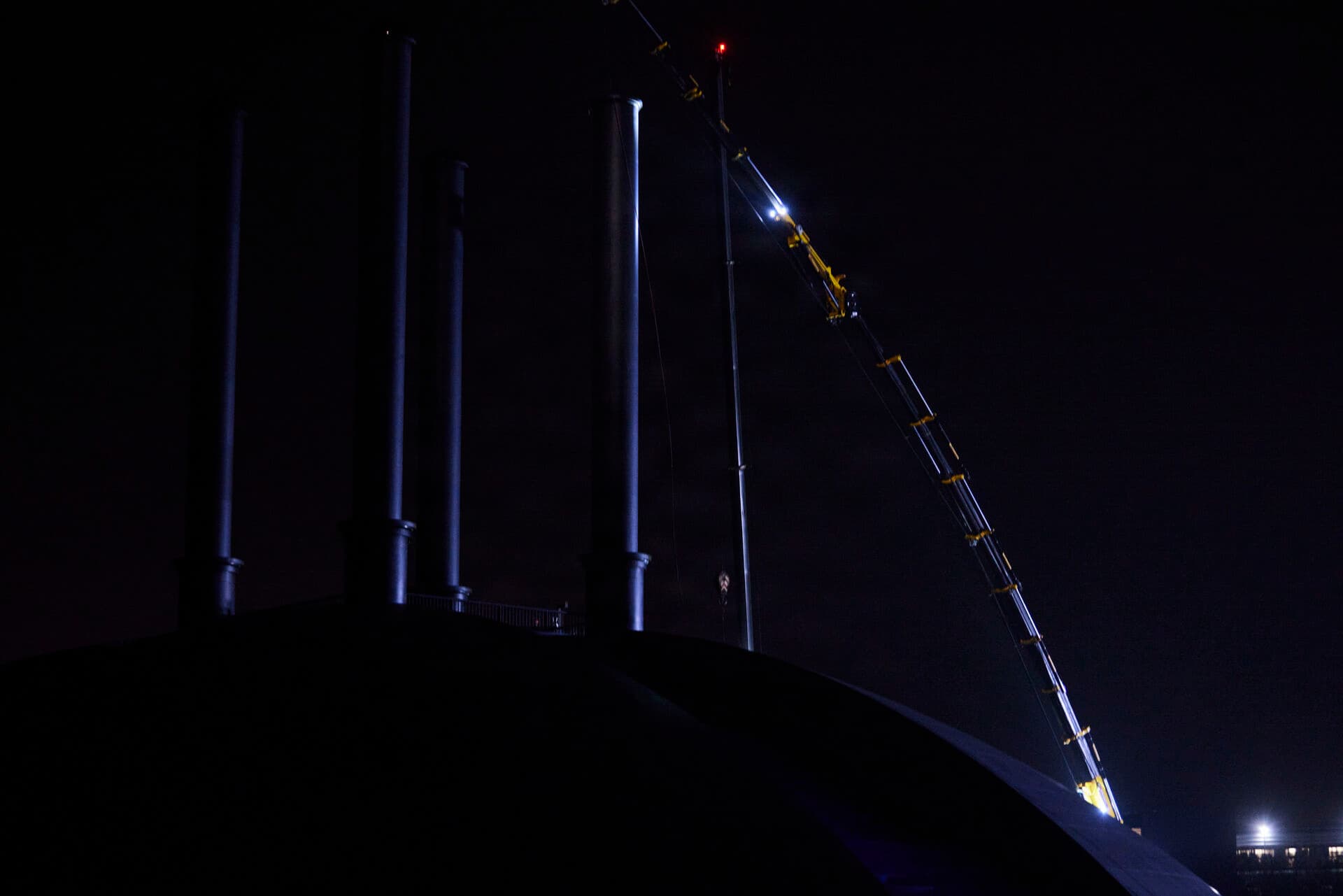 En kæmpestor kran hænger over kunstværket Elias fire tårne. Ned fra kranen hænger en 46-årig smed i en særlig stol af stof. Han skal hejses ned i et af tårnene for at skære nogle metalplader over.